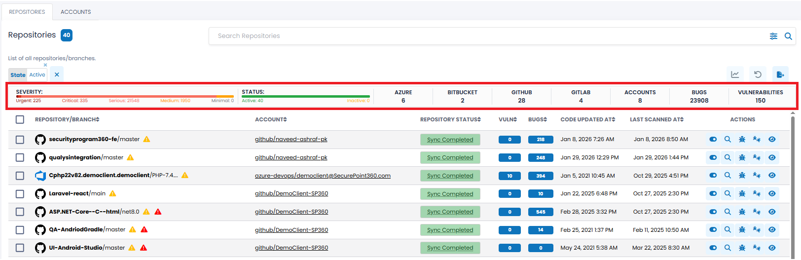 The “Repositories” tab lists all repositories and/or branches currently connected. SP360 will scan these repositories and/or branches looking for Vulnerabilities (and Bugs), as shown below.